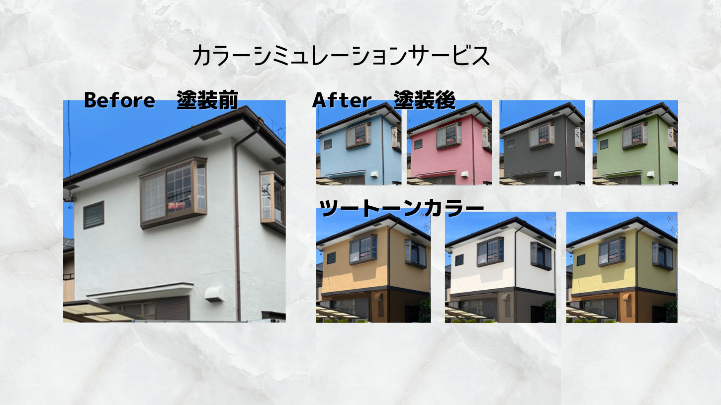 お知らせ カラーシミュレーションサービスの紹介 2023.04.23 現在、弊社では外壁塗装の見積もりの際にお客様に施工後のカラーをイメージしていただきやすいようカラーシミュレーションサービスを行っております。 ぜひ、ご利用ください。詳細はこちらより。 外壁塗装工事の施工事例を更新しました 外壁塗装の施工事例を更新しました