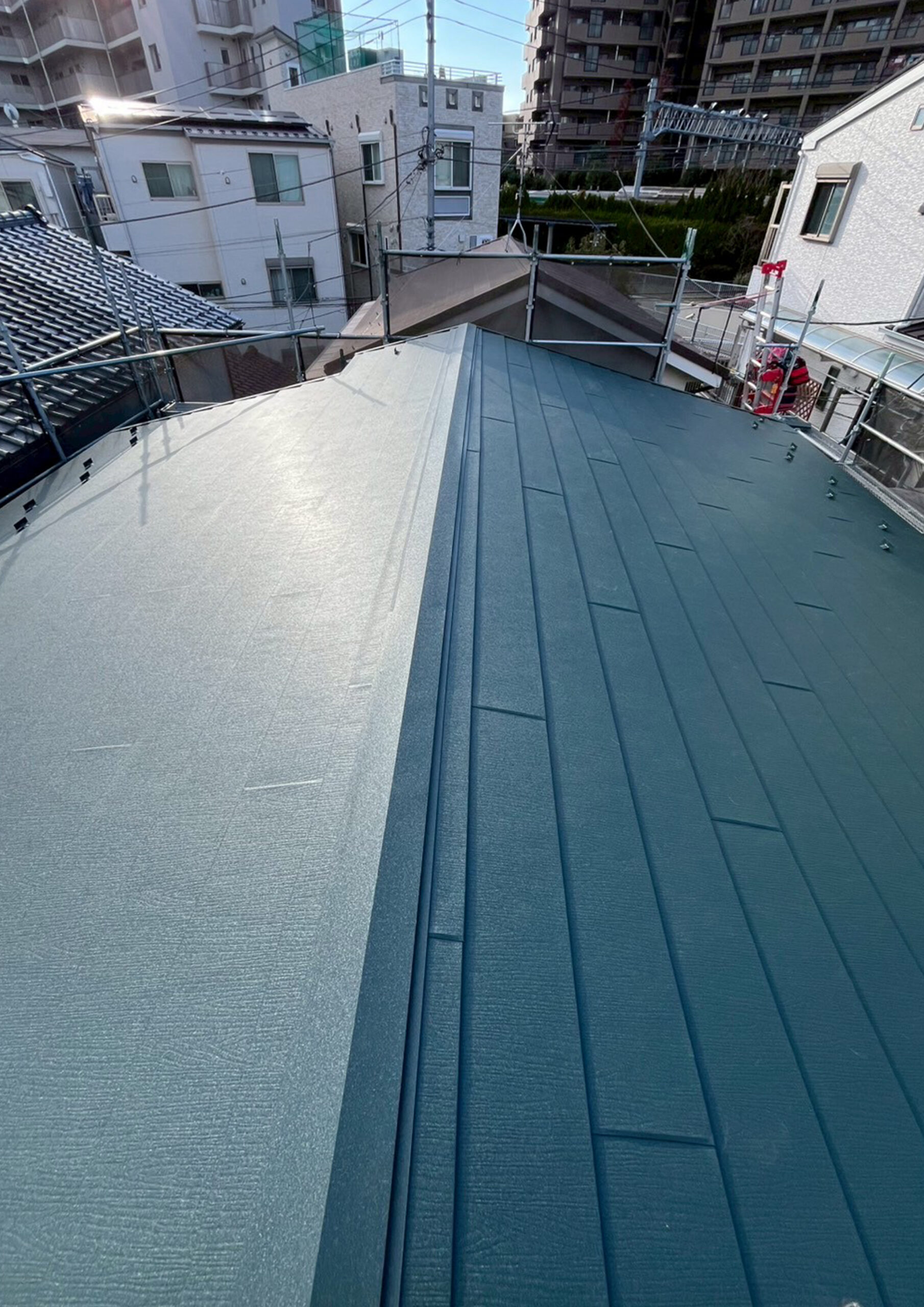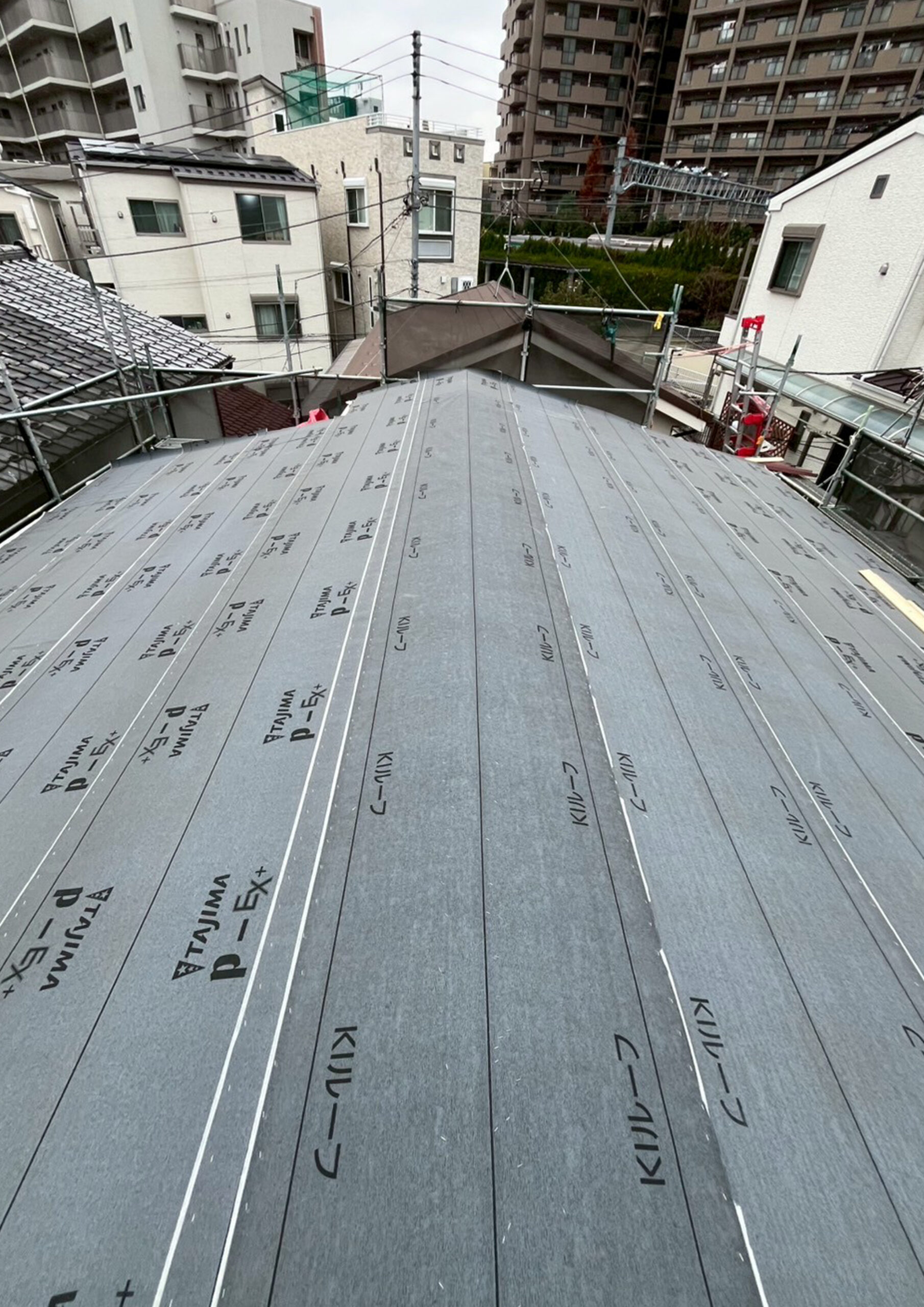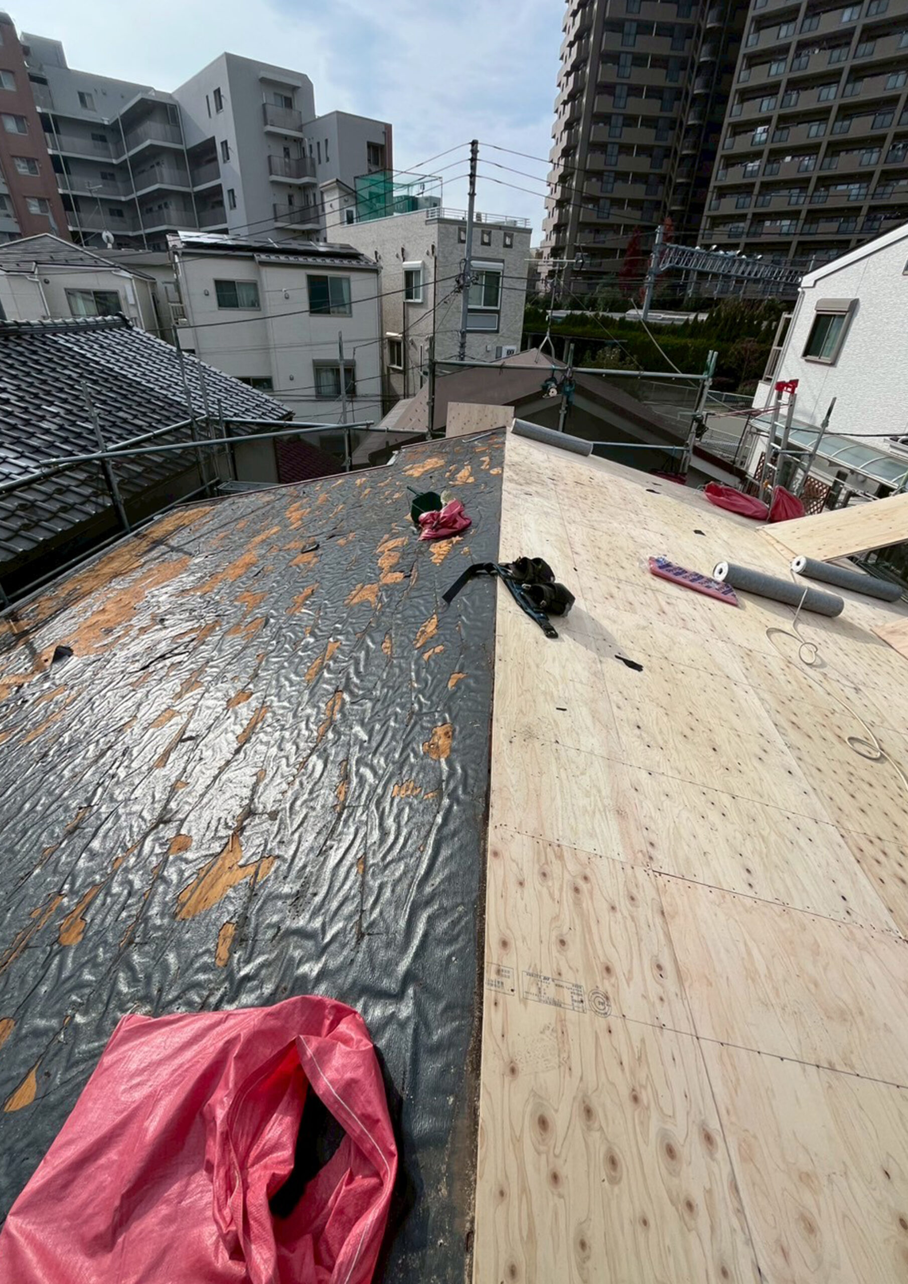 屋根の葺き替え 東京都杉並区 屋根葺き替え工事施工事例 施工前 施工後 既存屋根 既存屋根撤去 野地板張り 防水シート貼り 完了 施工詳細 エリア東京都杉並区 工期6日 費用120万円 使用屋根材IG工業 スーパーガルテクト 工事名屋根葺き替え工事 東京都荒川区 店舗外壁塗装 施工事例